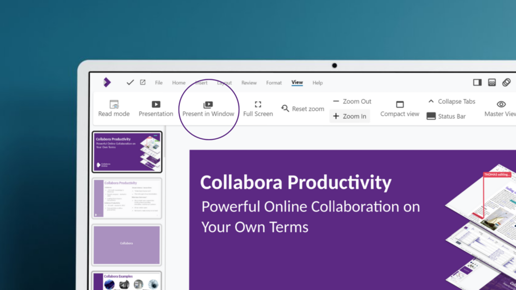New to Collabora Online 24.04, Present in Window opens a popup window with your presentation, perfect for screen sharing presentations during video calls, while still being able to access other windows and tabs as your present.
