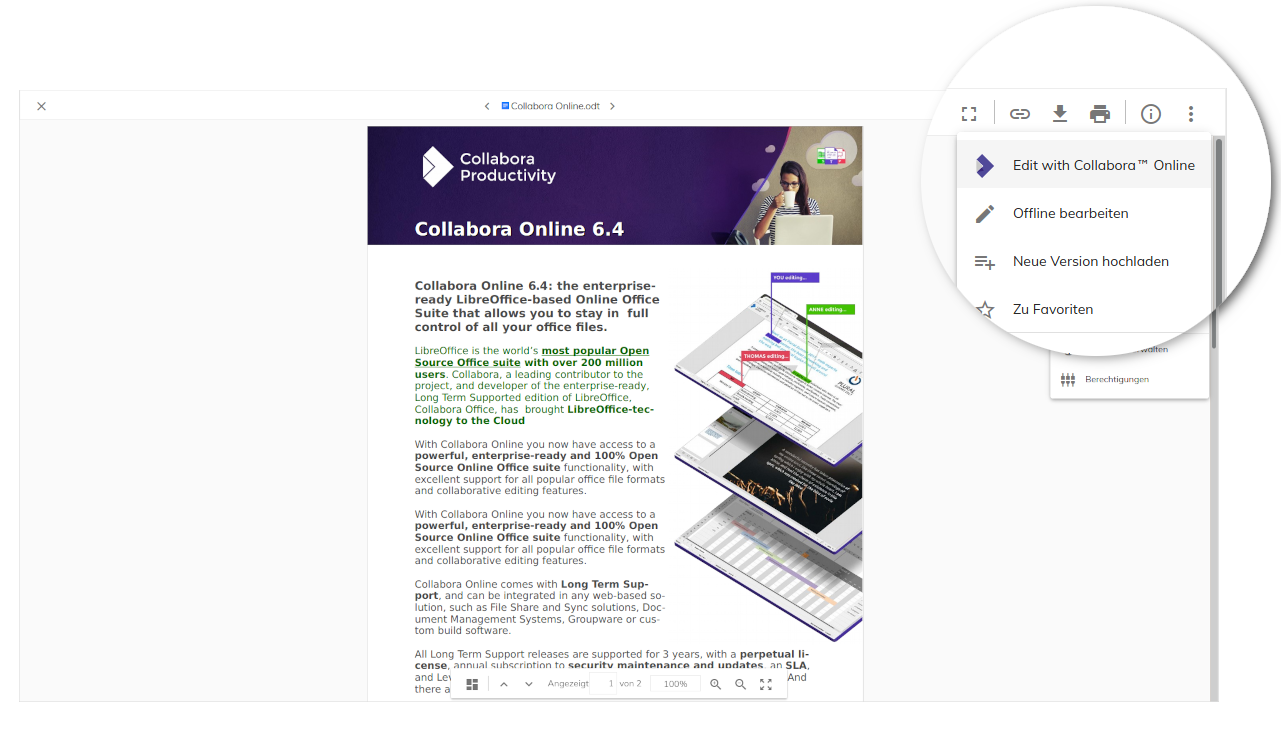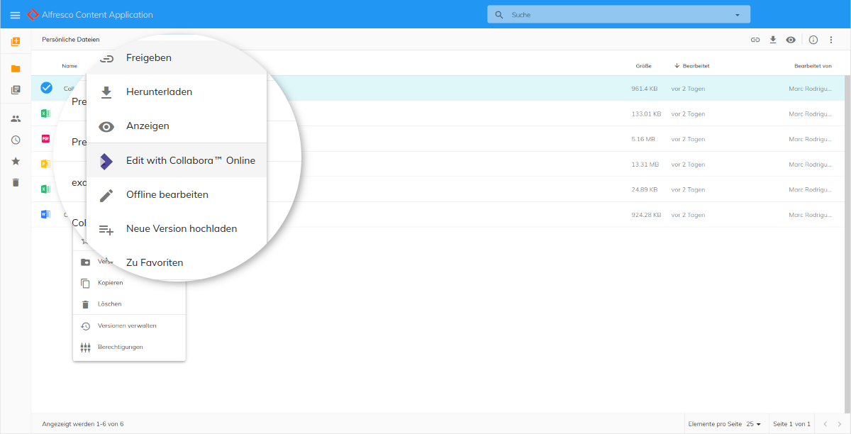 The “Edit with Collabora Online” functionality can be accessed through the menu, both via a right click or in the upper toolbar of Alfresco. You can see how the integration works on Jeci’s youtube channel.