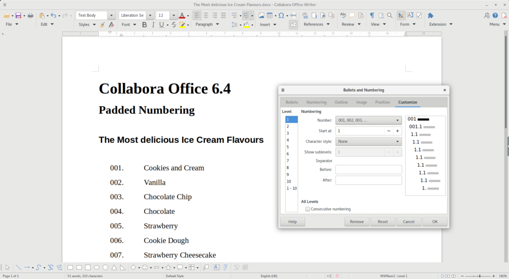 Padded Numbering is a feature in Writer developed by Collabora allowing you to automatically create listings with leading zeros. Miklos Vajna originally started working on it during one of our hackweeks. The functionality of this feature was later enhanced thanks to the sponsoring of Nicolas Christener from Adfinis. The feature makes the once manual workflow much more efficient and at the same time improves interoperability with the OOXML format.