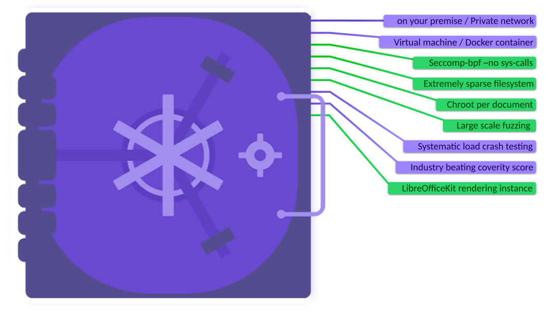 Unlike other cloud-based solutions, Collabora Online prevents your documents from leavingr your infrastructure. Deploy on-premises to maintain complete control over sensitive data and meet the strictest compliance requirements. Documents are processed in memory only, in a per-task silo and automatically cleaned up when sessions end.