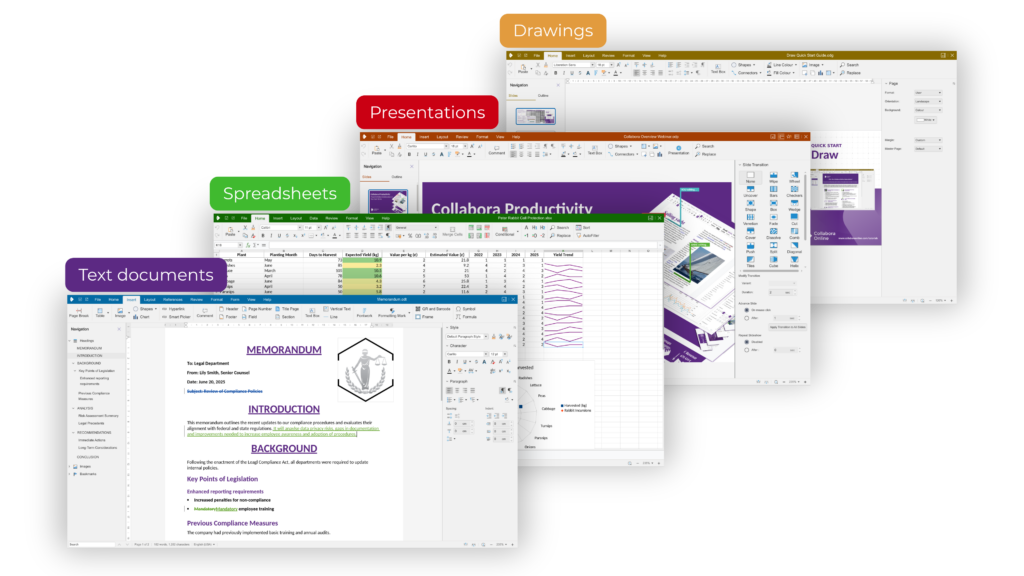Collabora Online is a powerful collaborative office suite that supports all major document, spreadsheet and presentation file formats, which you can integrate into your own infrastructure.